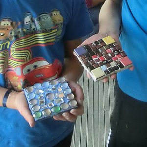 Zum wiederholten Male trafen sich Ende April über 60 interessierte Kinder zum Mosaik-Gestalten in der Braikeschule. Da das Wetter dieses Mal nicht so recht mitspielen wollte, verlegten wir alles nach drinnen. Jedes Kind durfte wieder eine oder mehrere Fliesen nach eigenen Vorstellungen mit Spiegelstücken, Mosaiksteinchen, Perlen, Glitzerblumen, etc. gestalten. Alle Kinder waren mit Begeisterung dabei und freuten sich über ihre gelungenen Kunstwerke.